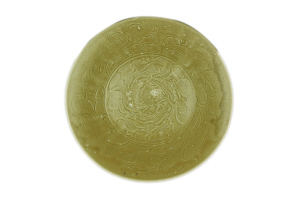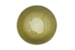 枇杷黃、釉色潤、深腹、斂口、小圈足的小碗,碗口以下弧線內(nèi)收,器內(nèi)壁劃刻簡筆花草間配“之”字形篦紋,器外通體劃刻折扇紋,這種特色的中國瓷應(yīng)“珠光”大師之名被譽(yù)為“珠光青瓷”,馳名世界。