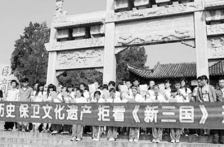 新《三國》將諸葛亮躬耕地搬到襄陽的劇情,引起了南陽人的強(qiáng)烈不滿。電視劇播出后,不斷有網(wǎng)友和當(dāng)?shù)貙W(xué)生到南陽臥龍崗武侯祠前聚會,他們一起誦讀“臣本布衣,躬耕于南陽……”,一起聲討新《三國》篡改歷史。
