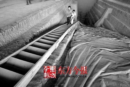 接著,工作人員在1號(hào)墓里發(fā)現(xiàn)了盜墓賊遺留下的墓道,一位大膽的電視臺(tái)攝像師鉆進(jìn)墓道想一探究竟。他說,這個(gè)墓道直通2號(hào)墓,三四十米長(zhǎng),在接近2號(hào)墓時(shí)有一些碎石和浮土擋道,但可看到2號(hào)墓透出的光線。