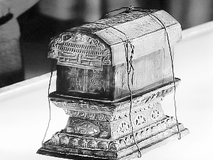 記者看到,整個(gè)啟請過程中稍微有點(diǎn)難度的就是須彌座的長方形金棺銀槨。這套金棺銀槨長和高約為15厘米,寬約六七厘米,槨蓋上有細(xì)密的花紋,前頭還垂下了兩重屋檐。槨身四周有持金剛杵的天王或力士站在門前,代表天龍八部,即佛祖的護(hù)衛(wèi);還有吹笛和排簫的天女天象,衣帶飄飄仿佛凌空飛行。須彌座是由佛座演變來的,這個(gè)銀槨的造型明顯寓意佛祖居住的宮殿。銀槨內(nèi)是一個(gè)小一號(hào)的金棺,用金絲捆扎,防止棺蓋滑脫,F(xiàn)場,專家們用手輕輕“推”著捆綁的金絲,沒用幾分鐘,就解開了千年謎底,露出了里面的佛頂真骨。