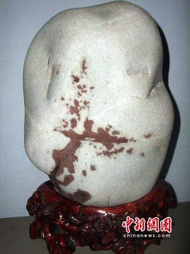 記者細(xì)細(xì)觀賞,該石頭18厘米,高24厘米。石頭通體純白晶瑩,在該石頭右下角,一樹(shù)紅紅的梅花伸出頭來(lái),在“冰雪”里傲然怒放,斗雪吐艷,玉樹(shù)臨風(fēng),真是“萬(wàn)花敢向雪中出,一樹(shù)獨(dú)先天下春!痹撌^圖案中,樹(shù)干、樹(shù)枝輪廓清晰,樹(shù)干、樹(shù)枝、花朵均為暗紅色,暗紅色的梅花花朵成形,遠(yuǎn)看疏影清雅,花色美秀。