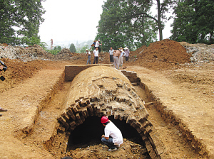 古墓的墓室總長約8.5米,寬約4.1米。古墓的券頂砌筑則十分講究,為三券三幅式六層,也就是一層豎排磚下疊壓一層橫排磚,共交疊成三券三幅。這類形制的待遇,只有明代功臣和王侯才能夠享用。記者從已經(jīng)破口的古墓后壁的洞口向里眺望,隱約能夠看見墓室是分為前后兩部分,就是分前后墓室。記者看見中間分隔墓室的門道為青石材質(zhì),分為左右開啟,高約近2米,寬達1米左右,顯得十分厚重。據(jù)了解,23日上午出土了一對墓志,被運回博物館。目前,墓室里究竟埋藏著什么寶物,還有待進一步發(fā)掘。
