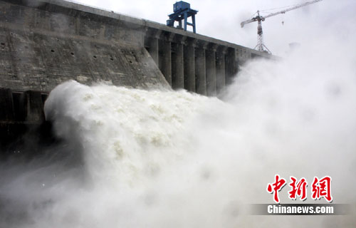 中新網(wǎng)丹江口7月22日電 (陳攀霄)22日13時(shí)24分,丹江口大壩開閘泄洪,這是丹江口大壩主體工程全線貫通以來首次開閘泄洪。