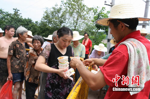 中新網(wǎng)廣安7月22日電( 廖小兵 劉長河)在剛剛遭受160年未遇的特大洪災(zāi)中,四川省廣安區(qū)肖溪鎮(zhèn)老街被整體淹滅,街道清淤還未結(jié)束,1000余人無家可歸。目前災(zāi)民生活得怎么樣?22日中午12時許,記者來到肖溪鎮(zhèn)中心街下段的災(zāi)民集中安置點,只見兩排帳篷整齊地排列,在第三號帳篷,災(zāi)民杜超華一家正在吃著香噴噴的盒飯!昂樗畞淼锰土恕1热昵暗暮闉(zāi)高了2米多,我家的東西全部被洪水沖走了。幸虧黨委政府及時伸出了援手,給我們搭建了帳篷,購置了被褥,免費提供一日三餐。晚上還給我們送來了蚊香。盡管受了災(zāi),有了黨委政府的關(guān)愛,我們的家園一定會迅速重建起來。”