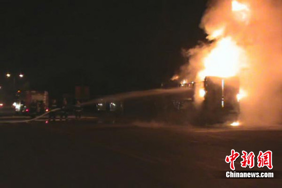 消防隊員針對現(xiàn)場情況,分別在車的四側(cè)鋪設水帶架設水槍陣地用對火進行撲救,20分鐘后,大火被撲滅。
