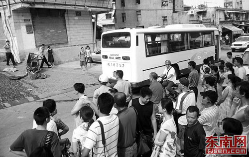 住在路邊四樓的周小姐目睹了車禍發(fā)生的經(jīng)過。她告訴記者:“當時我正站在陽臺邊梳頭,大約7:50的時候,一輛大客車從西邊開過來,車速不是很快。開到我樓下時,我看到車撞到了一個小女孩和一個老人,然后車子又繼續(xù)往下開,緊接著撞到一前一后兩名婦女,又撞到一名騎著三輪車的男子,最后左轉(zhuǎn)彎停下了!