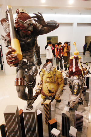 在展覽的最顯著位置,從川美畢業(yè)才兩年的“黃漂”王冕所做的雕塑作品“NEW YORK”引起了參觀者的格外關(guān)注,記者注意到,在這件作品中,唐僧的坐騎白龍馬加入了西方龍的造型,顯得有些面目可憎,而身上還貼滿了大眾、轟達(dá)等商標(biāo)。唐僧也成了蒙面人,孫悟空長了四只手,豬八戒肥碩的手臂上蓋上了“驗(yàn)訖肉檢”四個大字,而走在最后的沙僧擔(dān)子上挑的也不再是行李,變成了麥當(dāng)勞和重慶百貨的購物袋,四人如此游紐約,想起來就讓人忍俊不禁。
