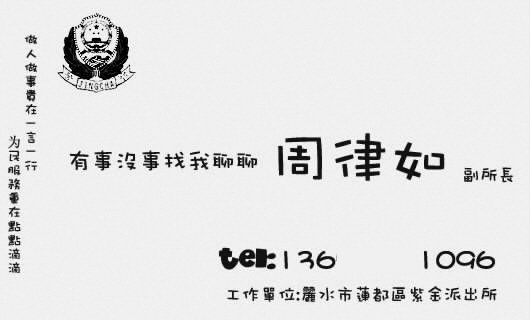 “有事沒(méi)事找我聊聊!睂W(xué)生周律如設(shè)計(jì)的名片上用活潑的美術(shù)大字寫(xiě)了這么一句話,落款是自封的“周律如 副所長(zhǎng)”!昂呛,副所長(zhǎng)當(dāng)然只是假想,不過(guò)我覺(jué)得要多和群眾接觸,才能做好服務(wù)嘛,所以我就這么設(shè)計(jì)啦!”小周說(shuō)。