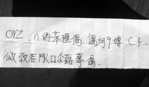 李女士的女兒剛剛上初中,前幾天,她為女兒整理書(shū)包的時(shí)候發(fā)現(xiàn)了一張字條:“orz,n侢芣理偶,偶妸9婹:(孒,倣敩茬閄囗尒蕗等偶”,上面大多數(shù)是一些看不懂的字,里面還夾雜了英文字母、數(shù)字和一些符號(hào),很像是“亂碼”。李女士查閱了《康熙字典》和《新華字典》,字典上根本就沒(méi)有這些字,尤其是那些符號(hào),怎么看也看不出里面有什么名堂。