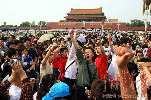 5月19日下午,天安門廣場上聚集了數(shù)萬名參與哀悼活動的群眾,在默哀完畢后,此起彼伏的“中國萬歲”、“中國加油”的聲音響徹云霄。幾名四川籍在京大學生用四川話激昂高呼“四川雄起”,在場的四川人奮起響應(yīng),很快,來自全國各地的人們都受到強烈的震動,一起吶喊起來,一聲聲感人肺腑的吶喊聲在天地間回蕩,一雙雙舉著國旗的手臂在廣場上有力的揮舞,廣場漾起了一片血色的愛國暖潮。