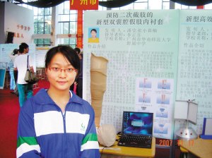 隨后,潘瑩的假肢內(nèi)襯墊獲得第五屆廣東省少年兒童發(fā)明獎一等獎,08年4月獲得第二十三屆廣東省青少年科技創(chuàng)新大賽金獎。現(xiàn)在,在廣東省青少年科技創(chuàng)新大賽組委會的支持下,她的產(chǎn)品申請了專利,現(xiàn)處于臨床測試中。