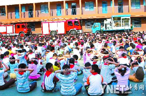 “發(fā)生地震了,如果來不及跑出教室,就立即躲到桌子下面或抱頭蹲到承重墻下,等短暫的地震過后,再迅速撤離教室。如果在衛(wèi)生間內(nèi)要找墻角抱頭蹲下!毙W生們在消防官兵指導下,都作出同樣動作,在操場演練地震時逃生技能。“以前不知道地震是什么樣的威力,四川地震以后我們學校老師也講了關(guān)于地震的好幾次課!彼哪昙壍啮┱f,她學會了“抱頭在桌子或者承重墻下面蹲下”的避震知識,回家要告訴爸爸媽媽。