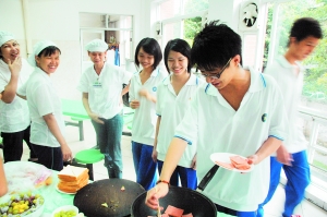 80后有“小皇帝”、“小公主”的“美稱”,那么90后是否也都“十指不沾陽春水”呢?近日,記者發(fā)現(xiàn)市真光中學的學生自發(fā)成立了家政社,還請飯?zhí)门ぷ雠嘤枌,報名情況火爆,其中高一女生小李語出驚人:“我不多學點家政,怕以后嫁不出去啊!”而記者調查五十名中學生發(fā)現(xiàn),其實71%學生對家務事感興趣,可惜缺少機會參與。