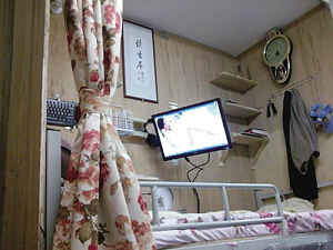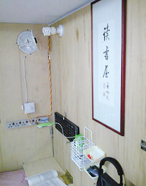 從論壇發(fā)布的照片上可以看到,三張木板及花色窗簾構(gòu)造了一個(gè)豐富的私人空間(圖一)。內(nèi)有照明、電腦及空氣循環(huán)設(shè)備,可伸縮的電腦屏幕和可隨時(shí)收合的寫字臺(tái),鍵盤、鼠標(biāo)和耳機(jī)掛在墻上(圖二),使用的時(shí)候只要旋動(dòng)一個(gè)旋鈕,東西就可以拿下來在任何地點(diǎn)使用。這個(gè)狹小的空間內(nèi)還有三層木架,可放生活用品(圖三)。最吸引人注目的是該男生還在床頭掛了一幅墨寶——“讀書屋”。給人的總體感覺是,這是一個(gè)富有創(chuàng)意又勤奮好學(xué)的學(xué)生。