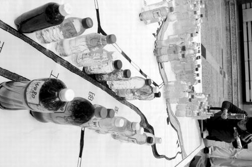 我們每天呼吸到的空氣,被裝進(jìn)了藍(lán)色的氣球里,高高地飄在地圖的最上面。它代表著沈陽市的藍(lán)天。氣球下面用透明的繩子拴著幾十張照片。仔細(xì)一看,這些照片有渾河沿岸美麗的風(fēng)光、有夕陽、有綠樹,有老人垂釣、有兒童嬉戲,也有學(xué)生們拿著瓶子取水樣的場景。而在地圖的最下方,則是一張平面的手繪渾河、衛(wèi)工明渠等沈陽水質(zhì)圖。圖的上面擺放著大小不一的塑料瓶,瓶里裝著學(xué)生們采來的水樣。