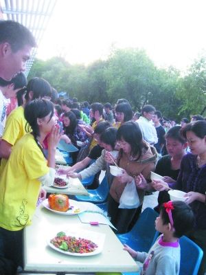 現(xiàn)場烹飪比賽結(jié)束后,各參賽隊伍把自己的成品展示在一排長長的桌子上,F(xiàn)場學生排起了數(shù)十米長的隊伍,人手一只碗,一雙筷,擺好陣勢沖著美食長龍開始了“掃蕩”!捌呃镲h香”雞翅,“盛世金蘭”南瓜煲......各位學生大廚一邊介紹一邊拉票,場面熱鬧非凡。 (記者 薛冰 實習生 林珍 通訊員 何淑賢)