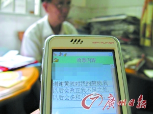 本報訊 (記者曾毅攝影報道) 今年74歲,曾任順德區(qū)人大代表的黃其廠老人,昨天終于等來了一條期盼多日的短信,“謝謝黃叔對我的鼓勵,我以后會改正我不足之處,以后多和父母溝通!