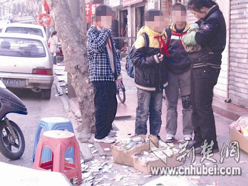 26日下午4時許,記者來到鄱陽街小學(xué)斜對面的一家副食店,門口丟著許多刮過的廢棄彩票。3名戴著紅領(lǐng)巾的男生圍著副食店的老板娘(如圖),其中一人掏出2元錢,買了4張彩票,現(xiàn)場刮開沒有中獎,嘆了口氣準(zhǔn)備離開。記者上前詢問該男生,他說,只要5角錢就能買一張彩票,揭開就有可能中獎,獎金從0.5元到100元不等。
