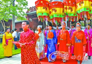 本報肇慶訊 (記者于敢勇 通訊員談細育攝影報道)德慶縣城的宋街和學宮昨日上午仿佛時光倒流回到宋朝時代:一大隊穿著宋代服裝的人馬出現(xiàn)其中,現(xiàn)場羅傘羅帳處處,鼓樂齊鳴,六藝齊舞翩翩。這里正上演該縣第8場“狀元禮”。