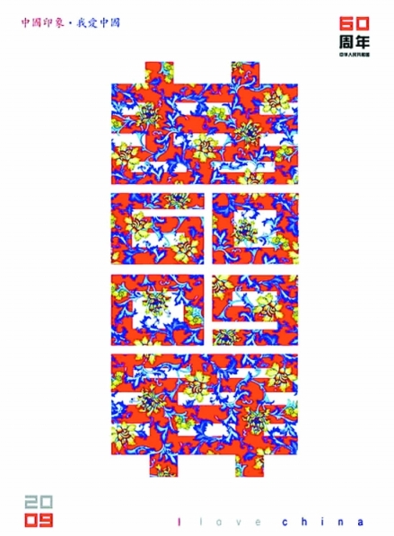 為迎接新中國60周年華誕,該校包裝系教授陳瞻最近特意設(shè)計(jì)了這一款海報(bào),其最大的特點(diǎn)遠(yuǎn)看是“囍”,近看又能凸顯出09和60兩個(gè)具體的主題,花紋和色彩設(shè)計(jì)烘托出喜慶氣氛。