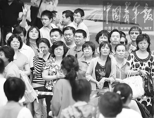 考試結(jié)束后,家長們紛紛探身張望著尋找自己孩子的身影。有家長從口袋取出塑料碗封好的點心,停在路邊的私家車也都發(fā)動起來,開著空調(diào)迎接。執(zhí)勤警察不斷地提醒家長后退,給考生讓路。瞬間,在校門口形成了兩排“夾道歡迎”的人群,“這里變成星光大道了,我們都是追星族!”一位家長調(diào)侃道,“真是可憐天下父母心啊”。