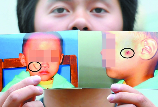 可10月20日發(fā)生的一件事,徹底激怒了小徐夫婦。那天,小徐去接女兒回家,發(fā)現(xiàn)女兒臉上竟然有三個(gè)血痕,一看就知道是小孩的牙印。“我當(dāng)時(shí)真是氣不打一處來(lái),孩子送到托兒所本來(lái)是買個(gè)放心,可現(xiàn)在卻弄成了這樣!