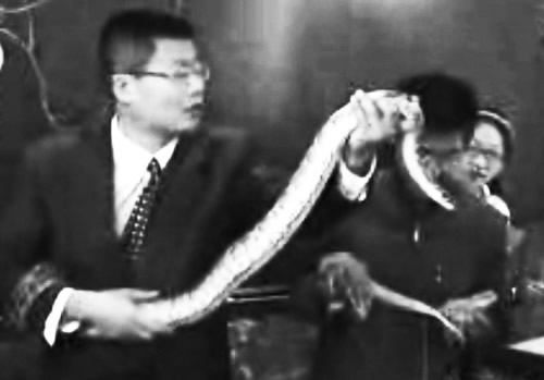 將一條長達2米多、重達5公斤的蟒蛇抱到課堂上當“模特”,教學(xué)生學(xué)習(xí)動物寫生的技巧。武漢市第五十九中教師鄒華章抱蟒蛇上課的視頻,近日在網(wǎng)絡(luò)上瘋傳。從10月27日上網(wǎng)到昨日,共有400多個網(wǎng)站轉(zhuǎn)載這一視頻,其中在一家網(wǎng)站的點擊率已高達12.6萬人次。