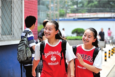 姐妹倆都是中關(guān)村中學(xué)的學(xué)生,姐姐叫王裔文,妹妹叫王裔靜。昨天姐妹倆一起出現(xiàn)在北大附中門口,接送的父母遠(yuǎn)遠(yuǎn)離開。和其他女生不一樣,姐妹倆走起路來虎虎生風(fēng),有點(diǎn)假小子的英氣。對(duì)于頻頻參加重大比賽的姐妹倆來說,似乎更能適應(yīng)高考的壓力。她們?cè)谛iT口興奮地和老師、同學(xué)們擊掌打氣,王裔文的班主任開玩笑地后退一步:“你的掌力那么大,我可吃不消。”
