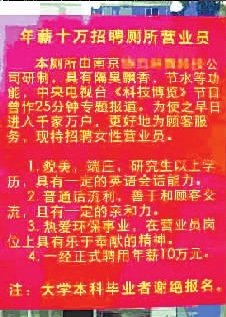 這條招聘啟事上商家自稱中央電視臺“科技博覽”曾經作25分鐘專題報道。要招端莊,貌美,研究生以上學歷,具備—定英文會話能力,年薪10萬,謝絕大學本科學歷者報名。