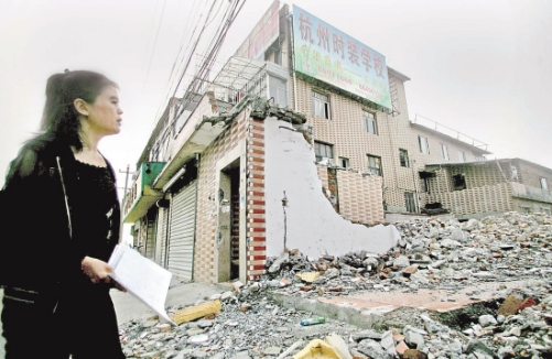 杭州彭埠鎮(zhèn)備塘路西邊是一大片廢墟,因為火車東站樞紐工程建設(shè),這里大片房子都拆走了。廢墟中,卻有一幢四層樓孤零零地站著。很少有人知道,這是一所時裝學(xué)校,學(xué)校里至今還有100多人在上課。由于四周房子都拆走了,學(xué)校樓房墻壁上出現(xiàn)了裂縫,樓面也有些傾斜,玻璃窗也壞了。為什么學(xué)校遲遲不搬?接到讀者報料后,記者來到現(xiàn)場。
