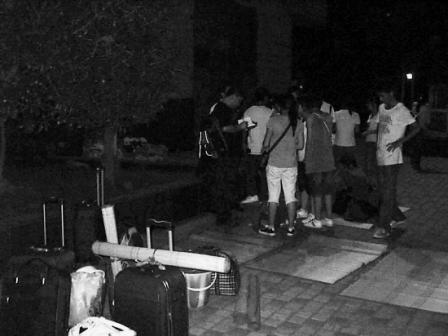 當(dāng)時(shí),大部分學(xué)生帶來(lái)的錢(qián)已經(jīng)用完了。有的一整天沒(méi)吃飯,有的連回家的路費(fèi)也不夠了。晚上10點(diǎn)半, 20多個(gè)學(xué)生蜷在中信國(guó)際大酒店停車(chē)場(chǎng)的綠化帶邊,打起了地鋪,身邊堆滿了大大小小的行李。14名女生和9名男生(除9人外,還有4名男生滯留其他地方)流落街頭。