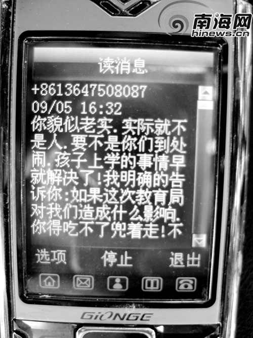 王才子給記者看了王校長辱罵他的短信。記者看了其中一條短信內容:“你貌似老實,實際就不是人,要不是你們到處鬧,孩子上學的事情早就解決了!我明確告訴你,如果這次教育局對我們造成什么影響,讓你吃不了兜著走!”另一條短信內容是:“象你這種貪得無厭的人,不但不想讓你孩子上好學校,還想拿孩子來賺錢,等我忙完了這整(原文如此——記者注)子,會找人跟你算清楚的!”