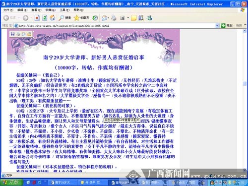 記者在QQ上與“南寧講師懸賞征婚”打招呼后,對(duì)方向記者做了說(shuō)明,他是在替他同學(xué)(即“南寧講師懸賞征婚”)掛著Q。當(dāng)記者向其表明來(lái)意之后,對(duì)方告訴記者,他同學(xué)太低調(diào),太謹(jǐn)小慎微。事實(shí)上他也知道,如果廣西和南寧市的媒體一介入,其實(shí)就是一種很好的宣傳,這樣他同學(xué)能找到好姑娘的把握會(huì)更大些。