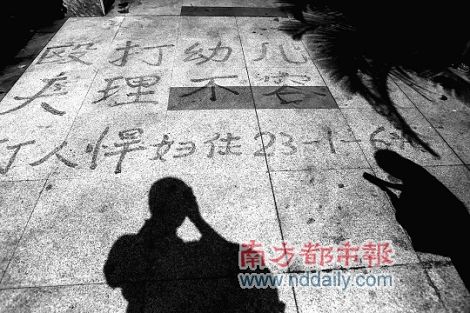 好事不出門,壞事傳千里。就是那沉重的一記耳光,蔣某成了小區(qū)“名人”,她所居住的23棟也成了鄰里關(guān)注的焦點(diǎn)。在該單位門口地上,一幅揮墨如潑的“書法”格外引人矚目,“毆打幼兒 天理不容 打人悍婦住23-1-××”,鄰居透露此乃被打男童蒙蒙(化名)爺爺?shù)慕茏鳌?/p>