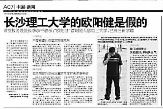 在長沙理工大學(xué)讀大三的“歐陽健”,在接受湖南媒體采訪時,也稱自己的成績和身份不假。26日,湖南某報(bào)推出跟蹤報(bào)道《長沙理工大學(xué)的歐陽健是假的》。報(bào)道稱,長沙理工大學(xué)教務(wù)處表示那里的“歐陽健”,冒用他人信息上大學(xué),已被取消學(xué)籍。