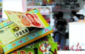 記者了解到,孩子們購買的“地下彩票”(見上圖,記者于濤攝)全都是5角一張。有的上面印著人民幣圖案,刮開后是什么面值的鈔票就能得到多少錢,有的就只能換到小玩具。眼看到了上學(xué)時(shí)間,孩子們還在不停地刮獎(jiǎng)。