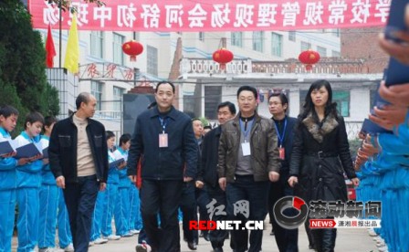 照片顯示,蓬安縣河舒初中數(shù)百名學(xué)生身著校服,整齊地列兩隊(duì)站在學(xué)校道旁,每人拿著一本書做朗讀狀。他們迎來(lái)的是蓬安縣教育局黨委書記、局長(zhǎng)姚勇和其他領(lǐng)導(dǎo)。懸掛在校門口的橫幅上寫著:“蓬安縣學(xué)校常規(guī)管理現(xiàn)場(chǎng)會(huì)河舒初中現(xiàn)場(chǎng)”,學(xué)校教學(xué)樓還掛了橫豎三幅巨大的歡迎標(biāo)語(yǔ)。