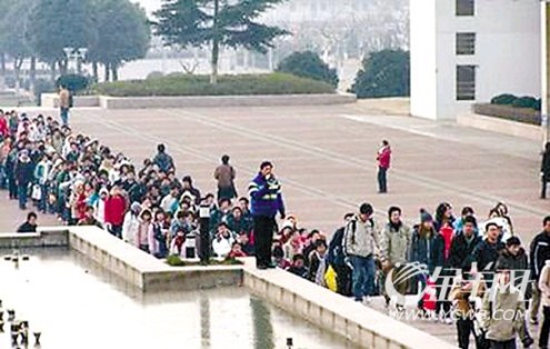 據(jù)瀟湘晨報(bào)報(bào)道,日前,網(wǎng)友“隨風(fēng)”在網(wǎng)上公布了一篇來自校內(nèi)網(wǎng)的日志,除了文字外還附帶8張照片,圖文并茂地描述了南京師范大學(xué)學(xué)生,在一個(gè)雨夾雪的寒冬清晨,在圖書館門前排起了綿延數(shù)百米的長(zhǎng)隊(duì),幾乎看不到頭。兩天里有近2000網(wǎng)友跟帖熱議,有人不相信這是真的。