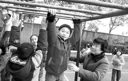 四年級(jí)的汪強(qiáng)投籃不小心摔倒在地,陶阿姨立即跑上前幫忙;四年級(jí)的幾位男生喜歡吊單桿,陶阿姨站在一邊做保護(hù)……今天早晨7:40,記者在浦東南路小學(xué)看到,護(hù)導(dǎo)老師和保安在校門口迎接每一位到校的學(xué)生;提前到校的學(xué)生,在附近居民志愿者的指導(dǎo)下,在操場上參加各種體育運(yùn)動(dòng)。