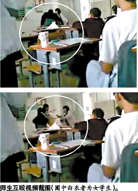 然而,該女生毫不示弱,拿起凳子扔向老師。打斗場(chǎng)面并未結(jié)束,老師再?gòu)囊贿厯炱鹪撆襾?lái)的板凳回敬了該女生,兩人一直廝打到教室門口處,直到一教師模樣的人從門外沖進(jìn)教室,雙方才結(jié)束“戰(zhàn)斗”。