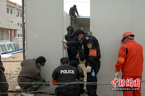 當(dāng)天下午,由成都公安特警30名青年民警組成的突擊隊(duì)與建材集團(tuán)員工一起先用挖土機(jī)將地面推平,然后隊(duì)員們分工合作、用帶來的發(fā)電機(jī)迅速發(fā)電,有的切割泡沫板,有的在鋼板上鉆孔,有的拼接泡沫墻面,在“5.12”抗震救災(zāi)時(shí)掌握的“施工技術(shù)”在這兒全用上了。這時(shí)的天空又一次飄起了雨夾雪,寒氣襲人,但特警隊(duì)員們?nèi)匀桓蓜攀。由于高原缺氧,一名?duì)員在劇烈搬送后出現(xiàn)了頭暈癥狀,其他隊(duì)員馬上將他扶到一旁休息,另一名隊(duì)員立即替補(bǔ)上去,他們就這樣輪番著作戰(zhàn)。在拼接板墻的時(shí)候,由于風(fēng)沙很大,隊(duì)員們眼睛、嘴里全是沙,但他們顧不了那么多,心中只有一個(gè)信念:就是以最快速度將板房建好,讓災(zāi)區(qū)的同學(xué)們?cè)缛諒?fù)課,參加學(xué)習(xí)。