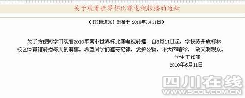 西財在校學生小徐在本報大成網(wǎng)新聞報料臺轉(zhuǎn)發(fā)了這則通知:“2010年南非世界杯開幕在即,世界杯比賽期間正值國家英語四六級考試和期末復(fù)習考試階段,為了維護學校的正常教學和生活秩序,確保同學們能夠正常的休息,以良好的狀態(tài)溫課迎考,應(yīng)廣大同學和學生家長的要求,學校決定自6月11日起至賽事結(jié)束,學生公寓熄燈以后校園網(wǎng)絡(luò)也將暫停使用。”