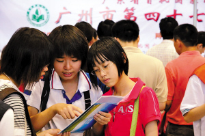 在廣州市司法職業(yè)學校、廣州市交通高級技工學校攤位現場,記者發(fā)現,有家長甚至是帶著學費來找校方報名的!皬V州亞運帶動城市地鐵發(fā)展,未來每個地鐵站將會配備10人左右的保安隊伍。我們學校的地鐵保安專業(yè)今年預計招五六十人,今天來預留資料的學生數就已經超過這個數目,招生情況很火爆!睆V州市司法職業(yè)學校校長黃耀壯介紹道。
