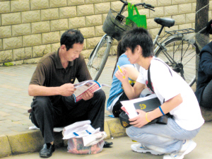 6月7日,高考的第一天。早上7點,當記者來到蚌埠市懷遠縣一中大門口時,發(fā)現(xiàn)這里除了正在等候考試的考生和家長,還有很多手里拿著大堆傳單和招生簡章的年輕人,并不斷地往家長和學生手里塞。