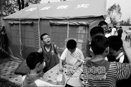 19日10時30分:谷勝聰坐在初一教學部的電腦前,15平方米大的帳篷里坐著近10名老師。檢查過記者的證件后,谷勝聰拿出一包潤喉糖,拿出一顆后又塞進包里。