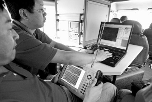 據(jù)了解,信息探測車?yán)锍斯P記本電腦顯示信號外,還有一臺專門監(jiān)測儀器。“信號傳送進(jìn)來后,無線電監(jiān)測儀就會發(fā)出信號,一旦發(fā)現(xiàn)可疑信號,會立即追蹤信號源,然后將其屏蔽。屏蔽的都是‘點(diǎn)’,附近的通訊不會受影響!惫ぷ魅藛T稱,昨天上午共截?cái)嗔藘蓷l信號。由于監(jiān)測到的時(shí)間較短,所以該儀器只能屏蔽信號源,考生的位置無法鎖定。截至記者發(fā)稿時(shí),公安機(jī)關(guān)已通過市信產(chǎn)局監(jiān)控的信號,抓獲了兩名傳送可疑信號的嫌疑人,并將其拘留作進(jìn)一步調(diào)查。
