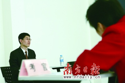 記者在現(xiàn)場(chǎng)看到,不少警校出來的考生都身穿警服來面試,這群“準(zhǔn)警察”在西裝革履的考生群中尤為醒目,但他們?cè)谶M(jìn)入考場(chǎng)上交手機(jī)等通訊工具時(shí),隨即被要求把警號(hào)摘下,以免在面試過程中透露個(gè)人信息,影響考試的公平性!霸鞠M诿嬖囍汹A取一些形象分和同行分,但效果并不大!币幻忌鷮(duì)記者說。參與面試的7名考官中,只有兩名是來自公安系統(tǒng)的同行,其余5名皆是來自其他行局的考官。