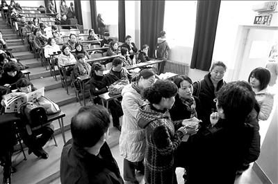 與往年一樣,今年中傳大仍推行網(wǎng)上報名,藝術(shù)類專業(yè)全部實行網(wǎng)上報名、網(wǎng)上交費、網(wǎng)上約考。由于很多考生反映未報上名,學(xué)校特意在2月7日安排人員為考生現(xiàn)場補報,但部分考生仍未能趕上這次補報。為給考生考試機(jī)會,昨天上午,學(xué)校在教務(wù)處臨時設(shè)置了一個報名點,方便學(xué)生補報。