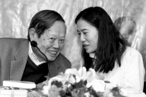首發(fā)式上,楊振寧身著西服精神矍鑠,翁帆穿白色上衣溫婉大方。夫婦雙雙坐定面向讀者時(shí),全場(chǎng)響起熱烈的掌聲。在隨后的活動(dòng)中,翁帆除了充當(dāng)楊振寧的“耳朵”,偶爾為他重復(fù)讀者、媒體的問(wèn)題外,倘若沒(méi)問(wèn)到自己頭上,基本一言不發(fā),關(guān)注著楊振寧及其他嘉賓的講話。聽(tīng)到楊振寧發(fā)表的觀點(diǎn)與見(jiàn)解后,時(shí)而點(diǎn)頭稱(chēng)贊,時(shí)而頷首微笑。