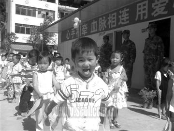 “好漂亮的鋼琴!媽媽?zhuān)@下我可以學(xué)唱歌跳舞啦!”昨日上午,彭州市龍門(mén)山鎮(zhèn)上傳出孩子們興奮的叫聲,一雙雙小手在嶄新的板房?jī)?nèi)四處摸索。這是5·12地震后,四川災(zāi)區(qū)建起的第一個(gè)“五星級(jí)”板房幼兒園。廣州空軍平日里修建機(jī)場(chǎng)、跑道的工程師們,連續(xù)奮戰(zhàn)7個(gè)晝夜,在廢墟旁為150名孩子重新建起了樂(lè)園。